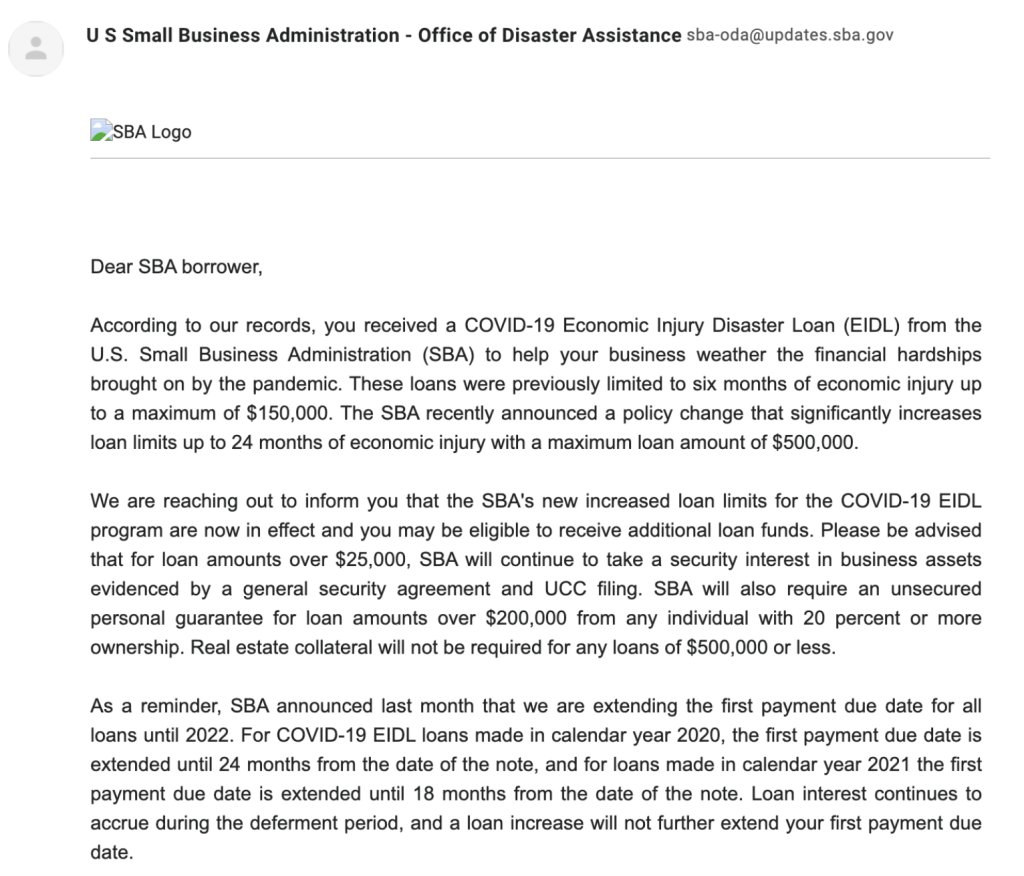 “Due to high volume of incoming requests, SBA reports it may be several weeks before a response is received from the agency on the next steps to follow. Those who request a loan increase should not resend multiple requests if they do not hear back right away from the SBA as the extra emails could slow down the overall response time.”