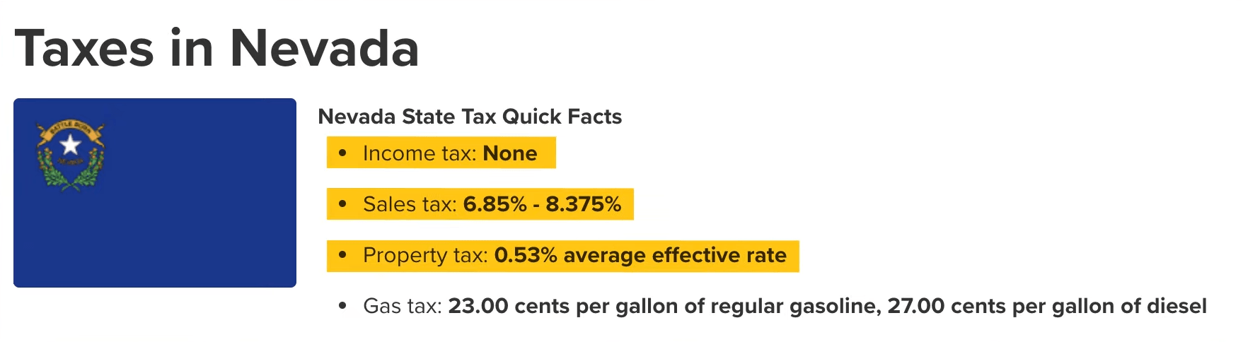 Nevada citizens pay 0% state income taxes, a decent share of sales taxes, and low property taxes.